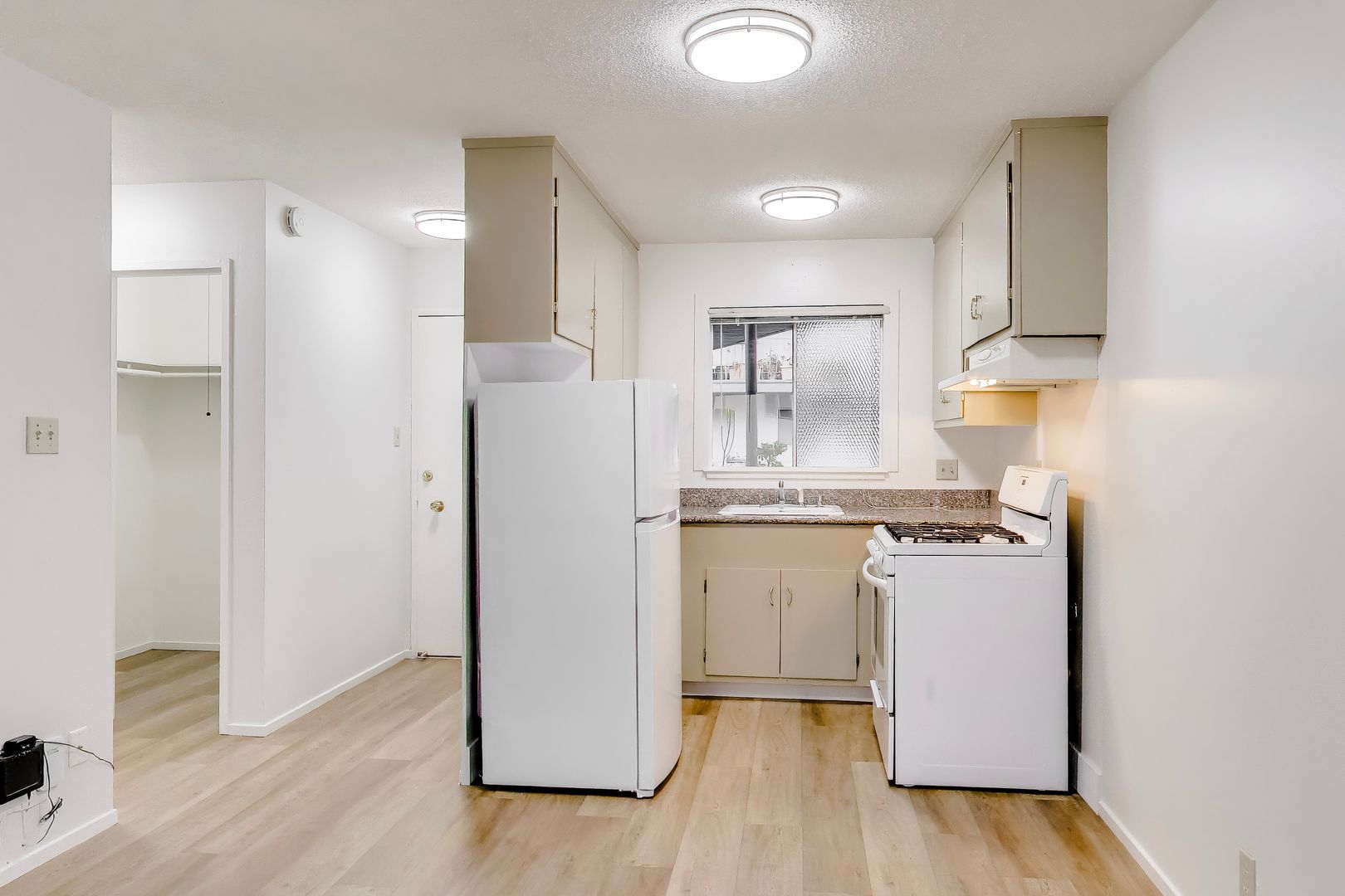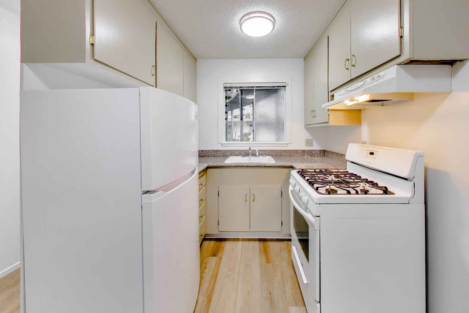 * Functional Kitchen: The galley-style kitchen is equipped with a gas range, full-sized refrigerator, and ample cabinet space, topped with durable granite-style countertops.
