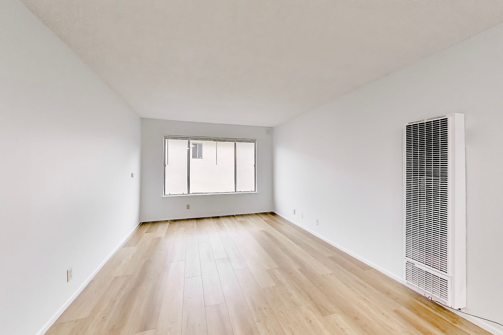 * Spacious Living Area: A large, open-concept living and dining space features beautiful light wood-style flooring and a massive window that fills the room with natural light.
