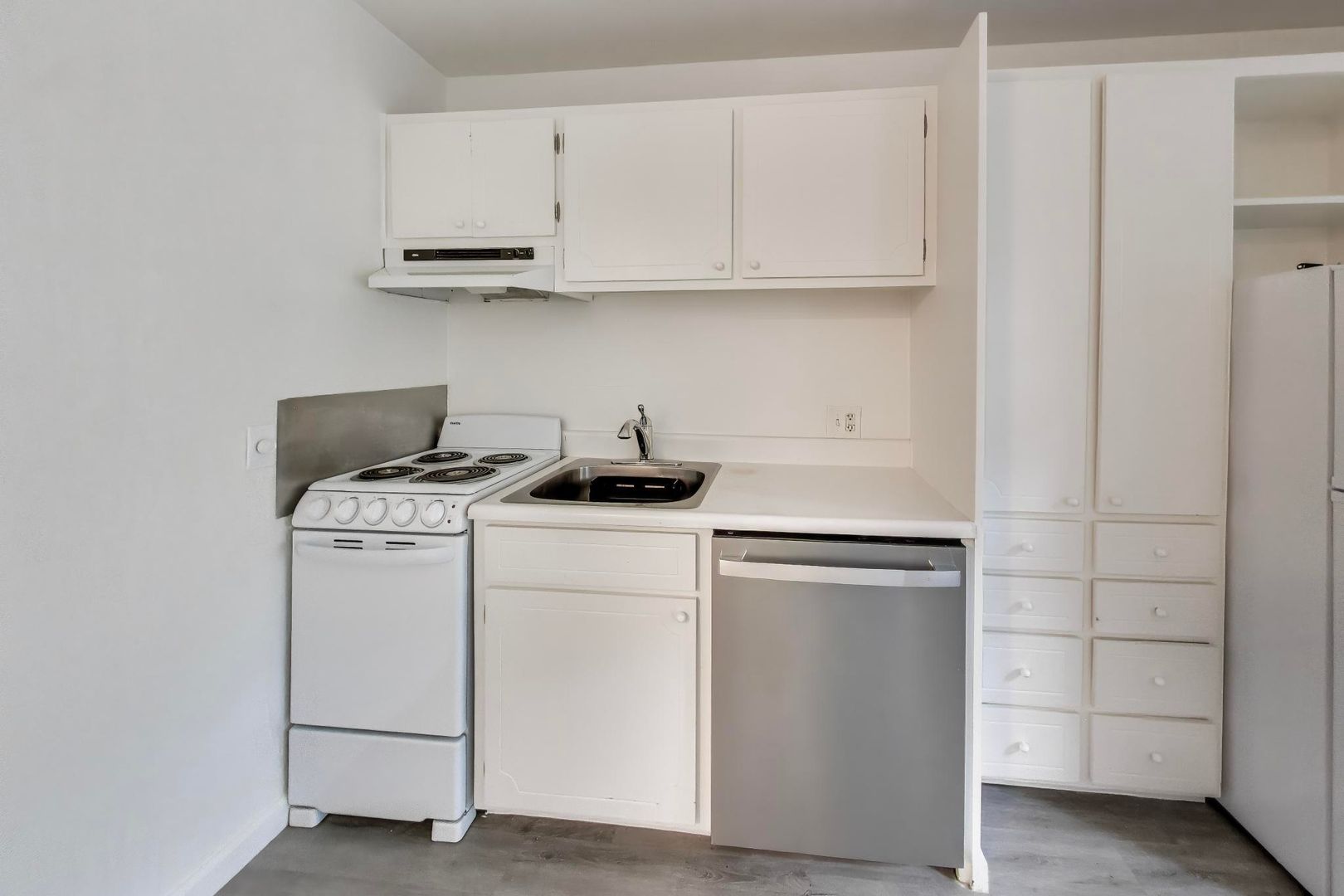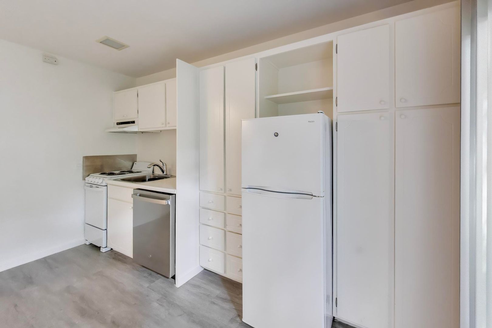 - immaculate galley kitchen with refrigerator and stove/oven